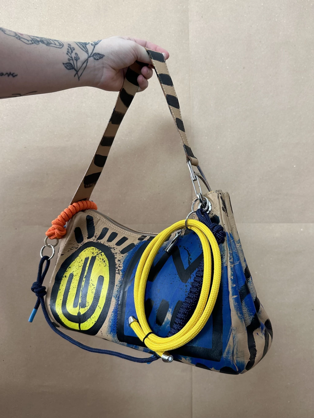 Cada bolsa recebe uma intervenção totalmente manual, feita por mim, com atenção em cada traço e cor. Não tem cópia, não tem igual — é arte única, daquelas que se destacam de longe e fazem qualquer look ficar mais interessante.