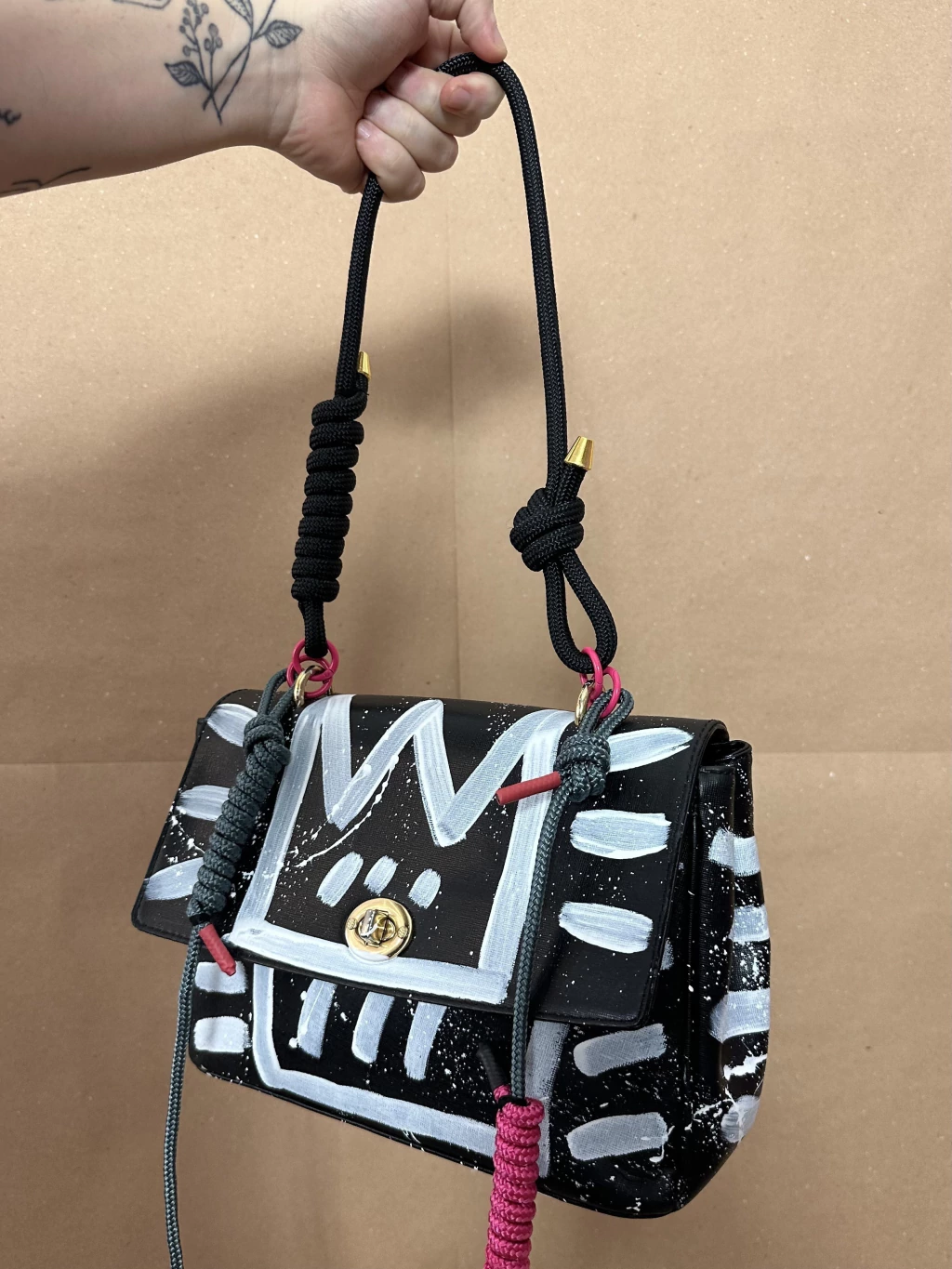 Cada bolsa recebe uma intervenção totalmente manual, feita por mim, com atenção em cada traço e cor. Não tem cópia, não tem igual — é arte única, daquelas que se destacam de longe e fazem qualquer look ficar mais interessante.